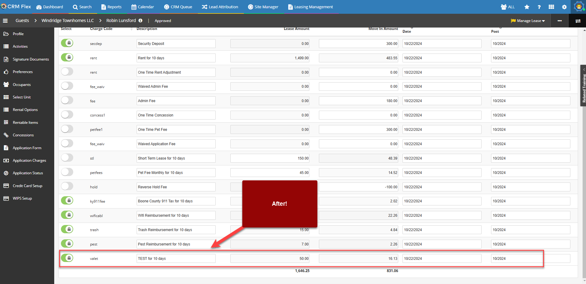 When this happens, the charges automatically appear for any new applicant/move-in created in the system moving forward. However, any existing applicant or future move-in that was in the system before the lease charge update will not automatically have this information. We will need to update or reset their charges in order to see them populate for the lease.