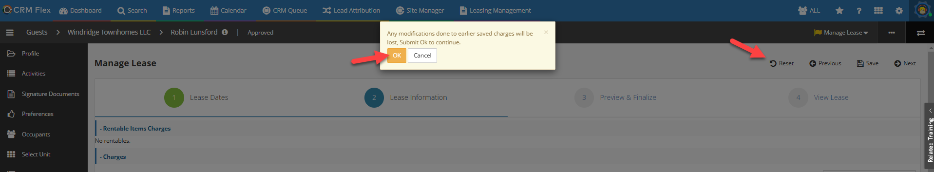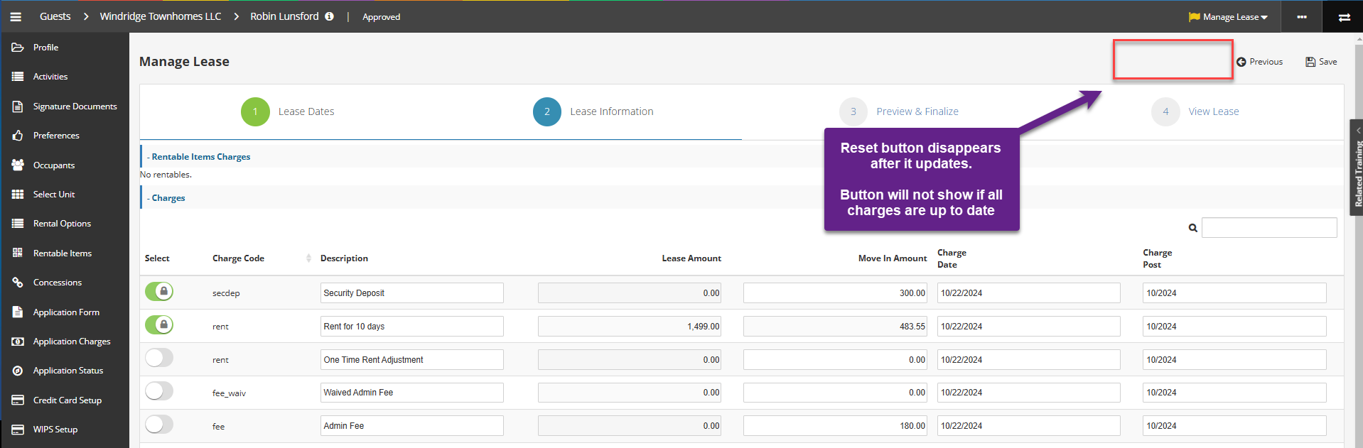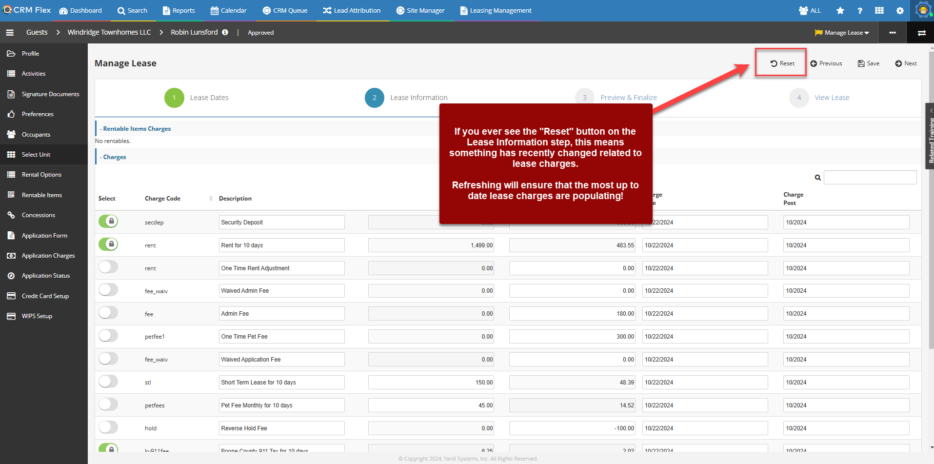 To update, click the Reset button and the click OK on the next pop-up. After this, the update charge line/amount will appear, and you can proceed with creating the lease.
